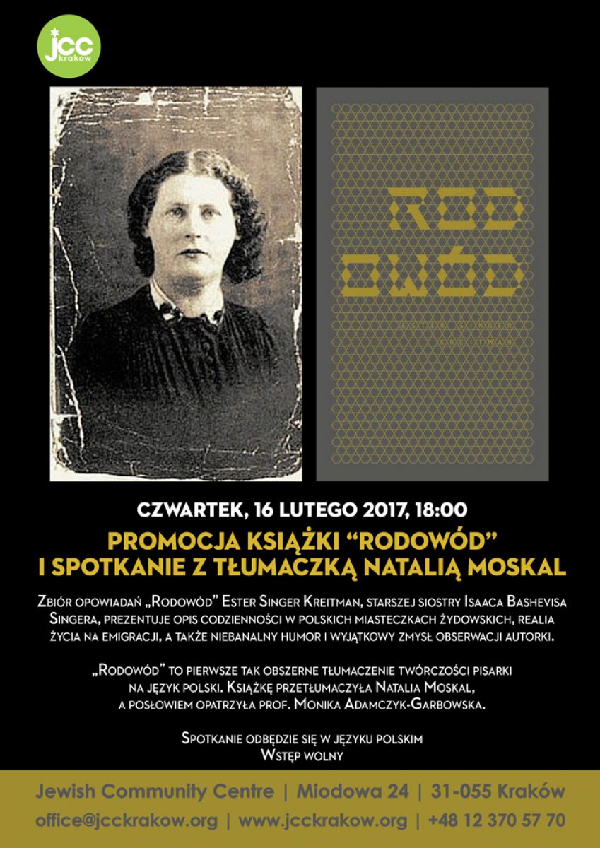 Zbiór opowiadań „Rodowód” Ester Singer Kreitman, starszej siostry Isaaca Bashevisa Singera, prezentuje opis codziennoœci w polskich miasteczkach żydowskich, realia życia na emigracji, a także niebanalny humor i wyjštkowy zmysł obserwacji autorki. „Rodowód” to pierwsze tak obszerne tłumaczenie twórczoœci pisarki na język polski. Ksišżkę przetłumaczyła Natalia Moskal, a posłowiem opatrzyła prof. Monika Adamczyk-Garbowska.