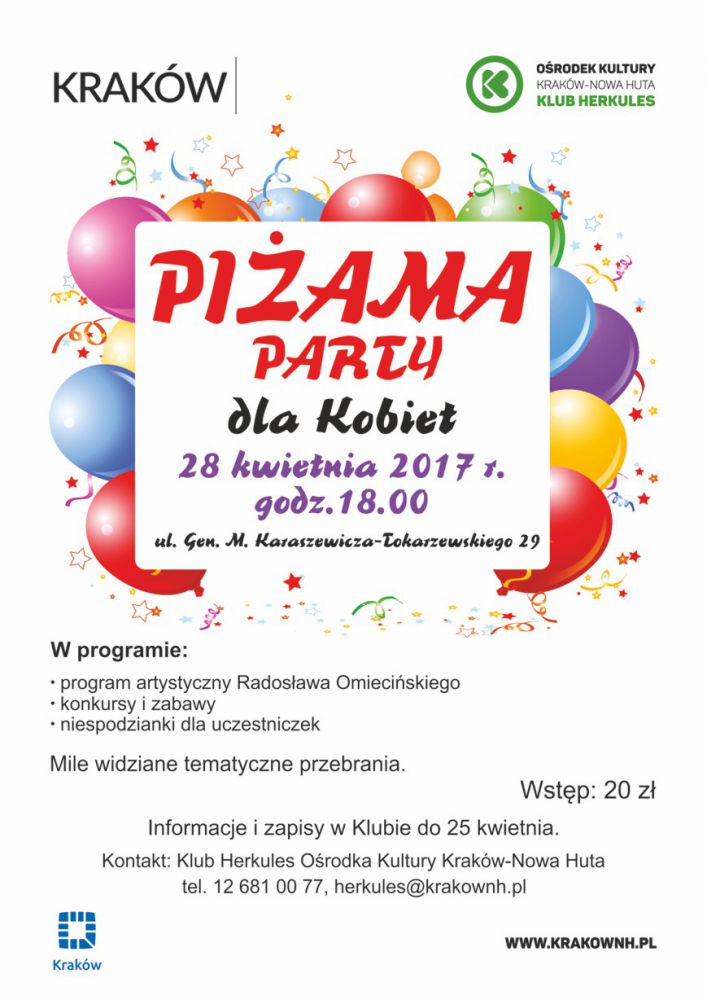28.04. od godz. 18.00 Klub Herkules Orodka Kultury Kraków-Nowa Huta (ul. Gen. M. Karaszewicza-Tokarzewskiego 29) zaprasza na PIŻAMA PARTY.