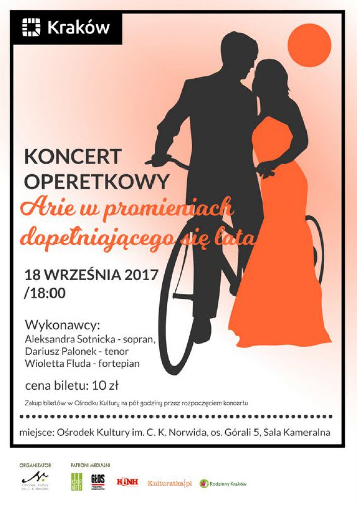 Serdecznie zapraszamy do Oœrodka Kultury im. C. K. Norwida na koncert artystów promujšcych muzykę operetkowš i musicalowš. Wykonawcy: Aleksandra Sotnicka – sopran, Dariusz Palonek – tenor, Wioletta Fluda – fortepian.