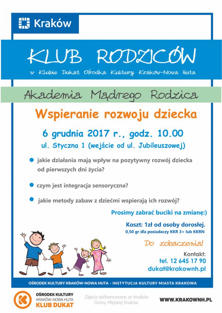 Wstęp: 1 zł od osoby dorosłej/zajęcia. Osoby posiadajšce Krakowskš Kartę Rodzinnš 3+ płacš 0,5 zł. Zajęcia dofinansowane ze rodków Gminy Miejskiej Kraków.
