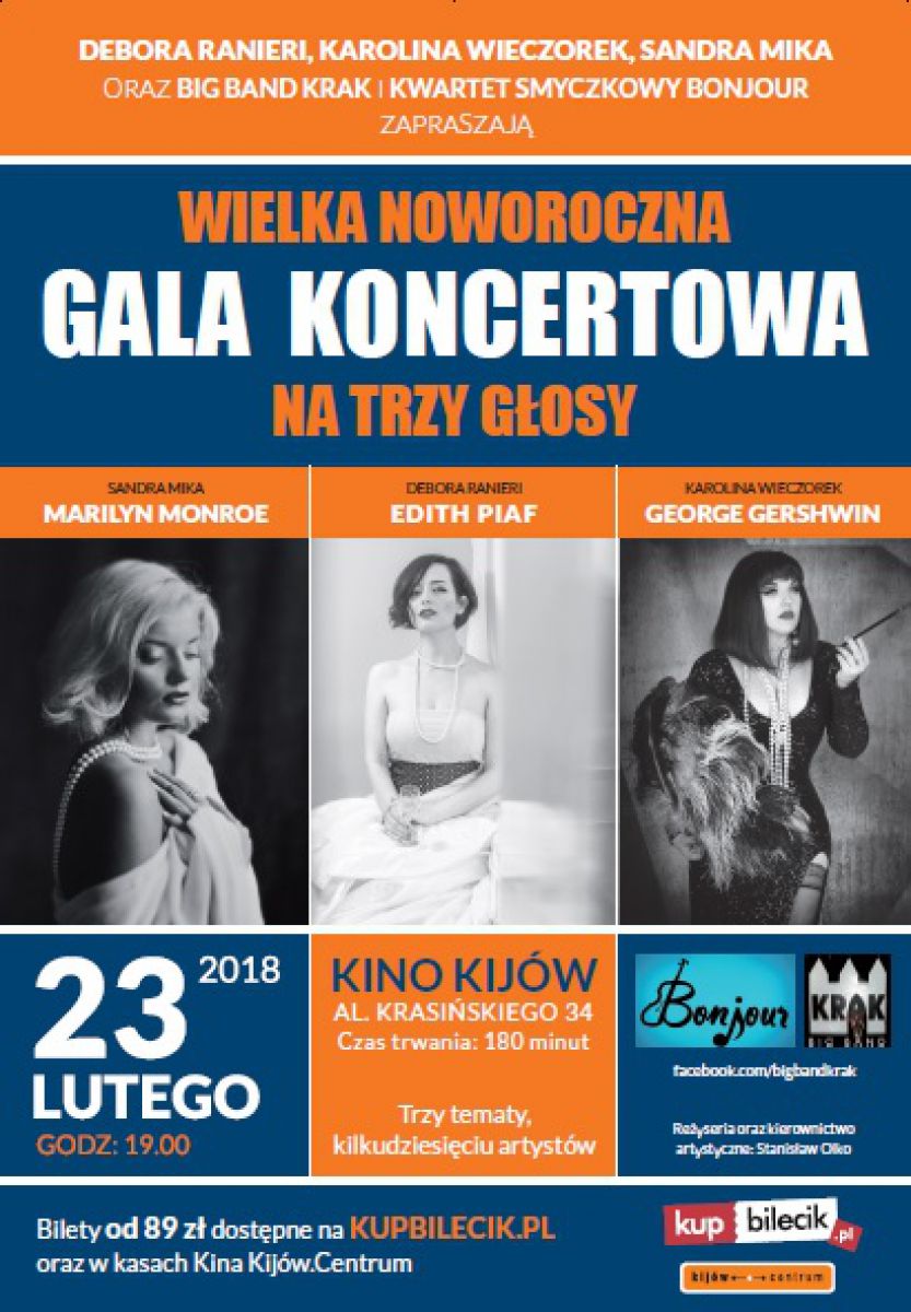 Big Band Krak wraz z Kwartetem Smyczkowym Bonjour, majš zaszczyt zaprosić Państwa na Wielkš Noworocznš Galę Koncertowš, która odbędzie się 23 lutego 2018 roku, w pištek, o godzinie 19.00, w Kijów.Centrum. Podczas koncertu trzy znakomite solistki zaprezentujš najbardziej nastrojowe oraz rozpoznawalne kompozycje z repertuaru Edith Piaf, Georga Gershwina oraz Marilyn Monroe, a nasz narrator wprowadzi Państwa w biograficzne wštki dotyczšce życiorysu każdej z gwiazd. Oprócz wyżej wspomnianego repertuaru, dodatkowo orkiestra zaprezentuje Państwu przekrój przez niezwykłe standardy jazzu big bandowego w ciekawych aranżacjach uskrzydlone finezyjnymi improwizacjami.