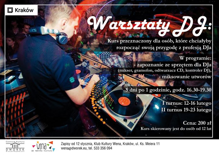 Uwaga!! Unikatowe warsztaty DJ w naszym Klubie. Zostały dwa z szeœciu miejsc dla osób od 12 rż.! Zajęcia poprowadzi Marcin Postawa, profesjonalny DJ. W programie m.in. zapoznanie ze sprzętem (np. mikser, gramofon, kontroler DJ), miksowanie utworów, podstawy i sekrety pracy DJ itd. Zajęcia odbywać się będš w trakcie Ferii i każdy z uczestników będzie miał zajęcia przez 1godz. przez pięć kolejnych dni (12-16.02), godziny do wyboru: 17:30 i 18:30. Koszt udziału 200zł (płatne tylko za całoœć, nie ma możliwoœci wykupienia pojedynczych zajęć).