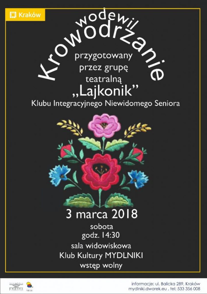 Stowarzyszenie "Lajkonik" oraz Klub Kultury Mydlniki serdecznie zapraszaj wszystkich mionikw komedii, farsy i groteski na wodewil "Krowodrzanie" w wykonaniu grupy teatralnej Klubu Integracyjnego Niewidomego Seniora.