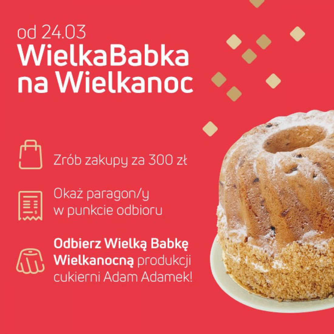 Już od 24 marca, za każde zakupy o wartoci co najmniej 300 zł i udokumentowane maksymalnie dwoma paragonami, klienci Centrum Serenada otrzymajš wielkš babkę wielkanocnš od Cukierni Adamek.