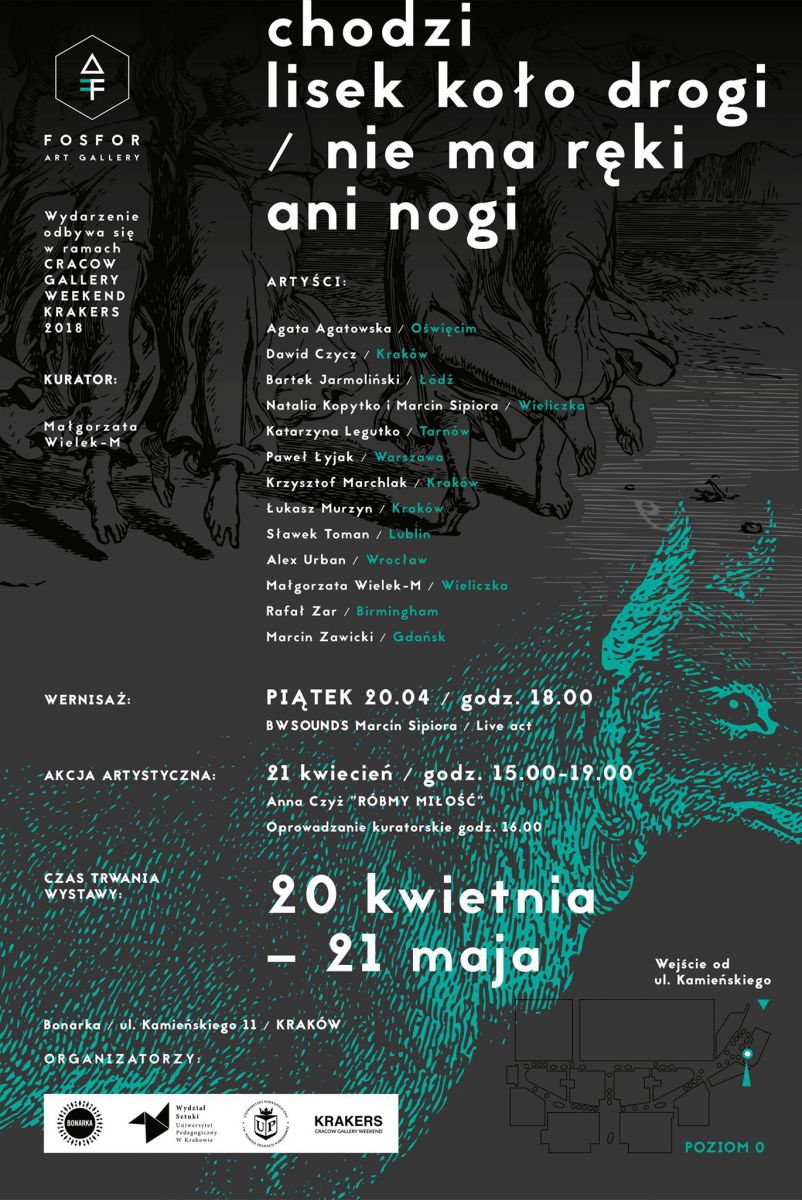 Już w pištkowe popołudnie nie lada atrakcja dla miłoœników sztuki współczesnej: poczštek wystawy zbiorowej 13 artystów. Motto tego multimedialnego wydarzenia, brzmi: „Chodzi lisek koło drogi, nie ma ręki ani nogi”. O co chodziło artystom, najlepiej wyjaœni Małgorzata Wielek-Mandrela, której oprowadzenie kuratorskie po wystawie zaplanowano na sobotę (21 kwietnia) o godz. 16:00. Wernisaż w pištek (godz. 18:00) otworzy set muzyczny w stylu live act Marcina Sipiory (BW Sounds).