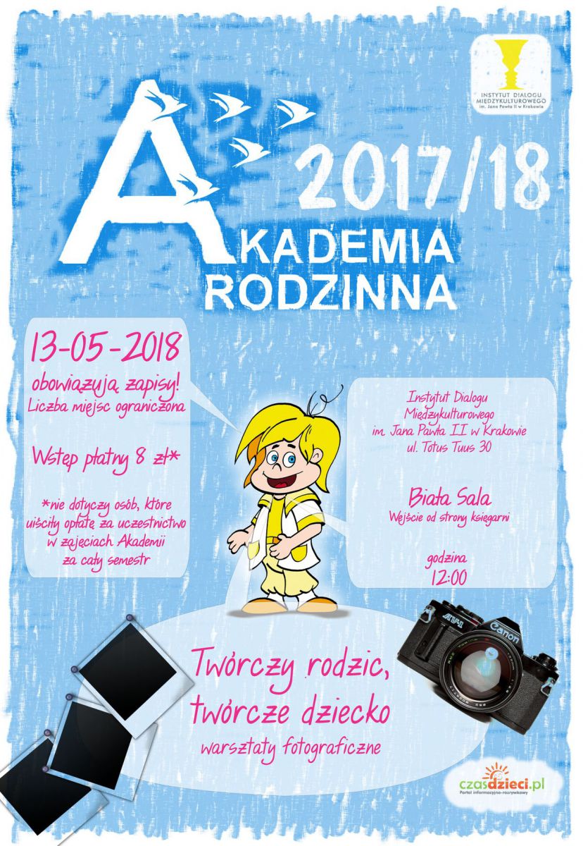Instytut Dialogu Międzykulturowego im. Jana Pawła II w Krakowie serdecznie zaprasza dzieci oraz rodziców na spotkanie Akademii Rodzinnej - Twórczy rodzic, twórcze dziecko, które odbędzie się w niedzielę 13 maja 2018 roku o godz. 12.00.
