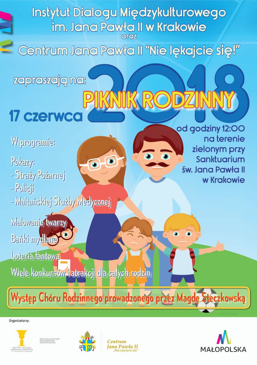 Instytut Dialogu Międzykulturowego im. Jana Pawła II w Krakowie oraz Centrum Jana Pawła II - "Nie lękajcie się!" w Krakowie serdecznie zapraszajš dzieci oraz rodziców na Piknik Rodzinny, który odbędzie się w niedzielę, 17 czerwca 2018 roku o godz. 12:00, na terenach zielonych przy Sanktuarium w. Jana Pawła II w Krakowie.