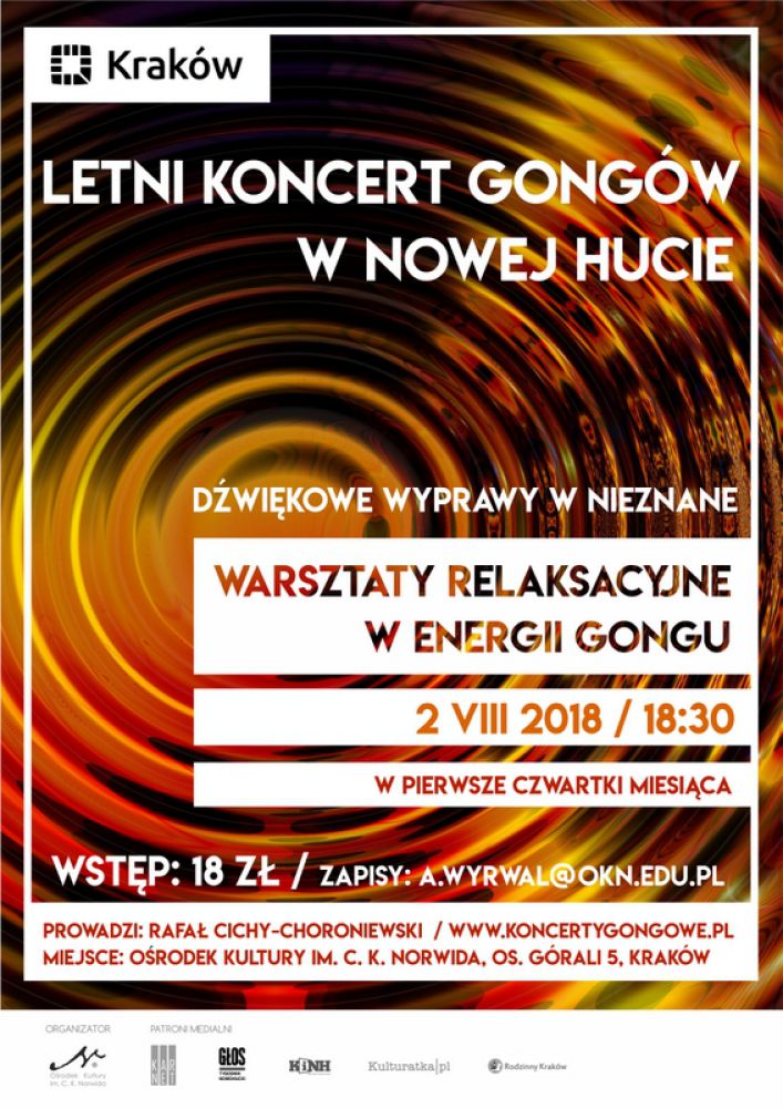 Relaks dla ciała i radoœć dla duszy to w jednym zdaniu cel udziału w koncercie gongowym. Wrażenia dostarczane słuchaczom przez dŸwięki gongu sš jedyne w swoim rodzaju, niepowtarzalne i nieporównywalne z niczym innym. Prowadzi Rafał Cichy-Choroniewski / www.koncertygongowe.pl.