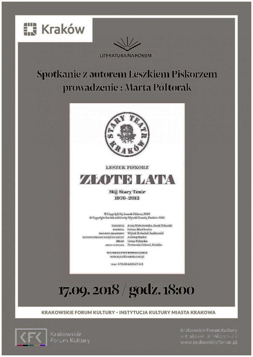 Spotkanie w ramach cyklu „Literatura na Forum”, podczas którego porozmawiamy z autorem o ksišżce Złote lata. Mój Teatr Stary 1970 – 2013. „W ksišżce tej po raz drugi Leszek Piskorz objawił się nam jako człowiek wierny swoim zasadom, wierny teatrowi i kolegom. Dzięki tej ksišżce niejednej osobie zakręci się łza w oku. Jest to wnikliwy zapis wspaniałego zjawiska, jakim był Stary Teatr w swoim „złotym okresie”. Możemy poznać nie tylko co wydarzyło się na scenie, ale też i to co ulotne i zapomniane – życie zakulisowe teatru. Leszek Piskorz przedstawia całš plejadę wspaniałych aktorów, reżyserów oraz ludzi współtworzšcych teatr z ich zaletami, a czasem z lekkš ironiš i przywarami. Wielu cudownych kolegów odeszło na zawsze. Powoli pamięć o nich blaknie. Autor sprawia, że cała barwna paleta barwnych, ciekawych i wybitnych osobowoœci odżywa na nowo. Dzięki Ci, Leszku.” – Jerzy Trela.