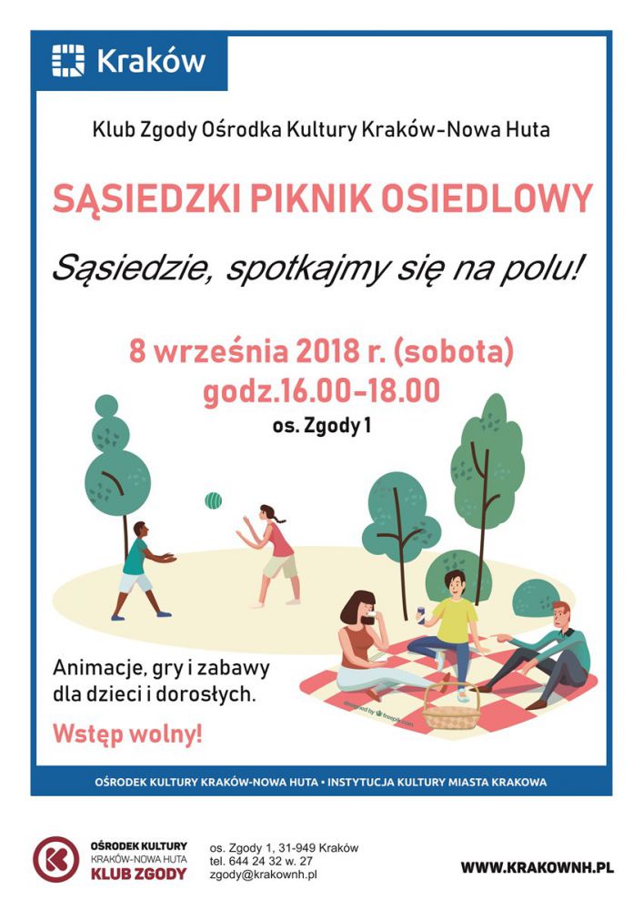 Klub Zgody Oœrodka Kultury Kraków-Nowa Huta (os. Zgody 1) zaprasza 8 wrzeœnia w godz. 16.00-18.00 mieszkańców os. Zgody i okolicznych osiedli na dwie godziny wspólnej sšsiedzkiej zabawy i piknikowania. Na dużych i małych uczestników pikniku czekać będš gry i zabawy podwórkowe, a wœród nich m.in. kšcik plastyczny, gry stolikowe, puszczanie baniek mydlanych, zabawy z chustš animacyjnš, kręgle, zabawy z szarfš i woreczkami czy rzut do celu. Będzie to także doskonała okazja do poznania się i integracji z często mijanymi na co dzień w poœpiechu sšsiadami. Sšsiedzie, spotkajmy się na polu!