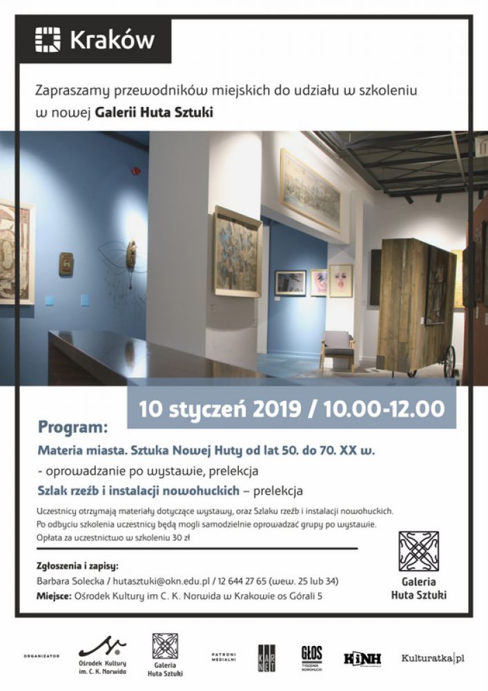 Galeria Huta Sztuki to nowe miejsce na mapie Nowej Huty. Dlatego zapraszamy przewodników miejskich do udziału w szkoleniu przygotowujšcym do oprowadzania po wystawie prezentowanej w nowej galerii - Materia miasta. Sztuka Nowej Huty od lat 50. do 70. XX w.