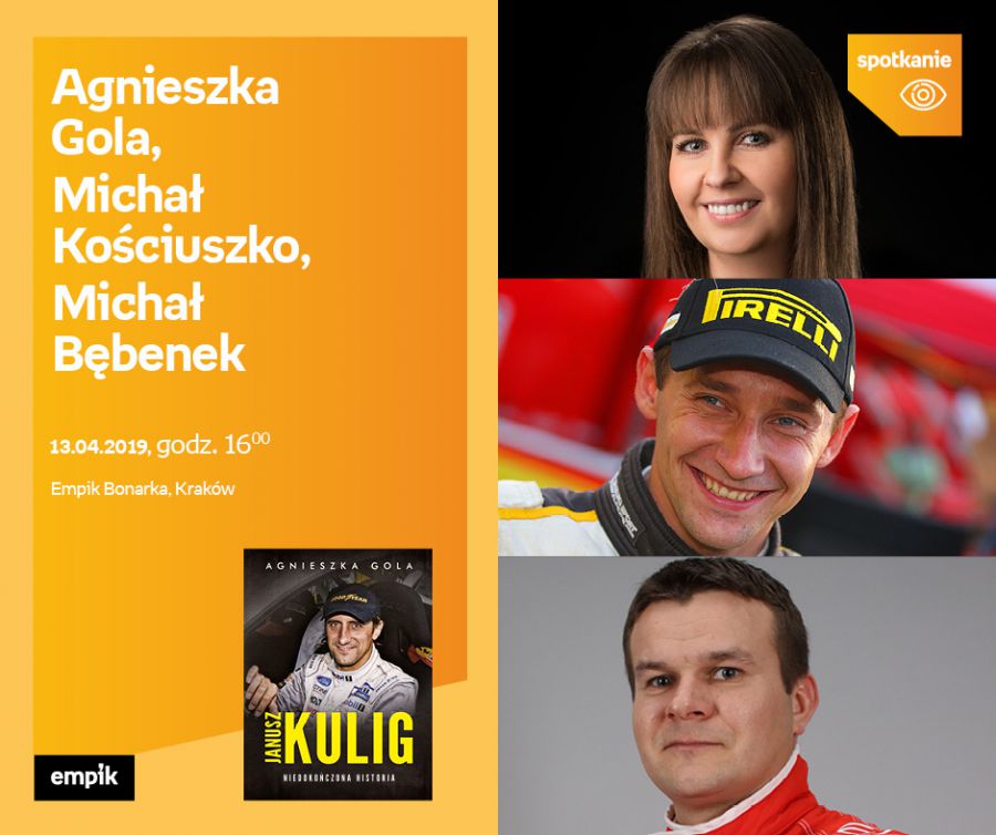 Agnieszka Gola w ksišżce „Niedokończona historia. Janusz Kulig” (Burda Ksišżki) postanowiła zebrać wszystkie dotšd nieopublikowane wspomnienia o jednym z najbardziej utytułowanych polskich kierowców rajdowych. To rozmowy z ludŸmi, którzy byli najbliżej: rodzina, przyjaciele, team sportowy, kierowcy i piloci rajdowi. Wœród nich Sobiesław Zasada, Leszek Kuzaj, Maciej Wisławski, Michał Koœciuszko i jeden z największych rywali Janusza – Krzysztof Hołowczyc. Jaki prywatnie był Janusz Kulig? Skšd wzięła się ksywka Rysopis? Co działo się za kulisami największych rajdów? Jakie sposoby miał Kulig na swoich rywali? Tego wszystkiego dowiecie się z ksišżki oraz podczas spotkania.