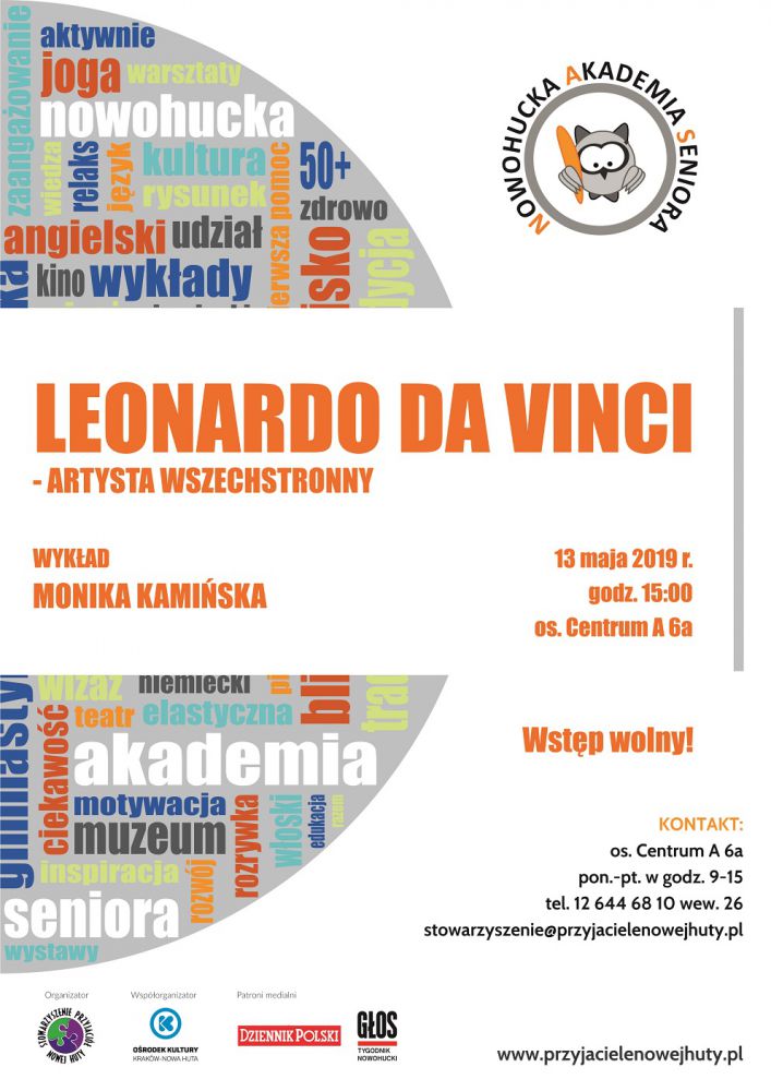 Nowohucka Akademia Seniora (os. Centrum A 6a) zaprasza 13 maja o godz. 15.00 na wykład z okazji 500 rocznicy œmierci najwybitniejszego twórcy renesansu – Leonarda da Vinci. Sylwetkę artysty, którego działalnoœć wykraczała daleko poza tradycyjne pojmowanie sztuki, a wyobraŸnia i pomysłowoœć wyprzedzały współczesnych o całe epoki, przybliży Monika Kamińska.