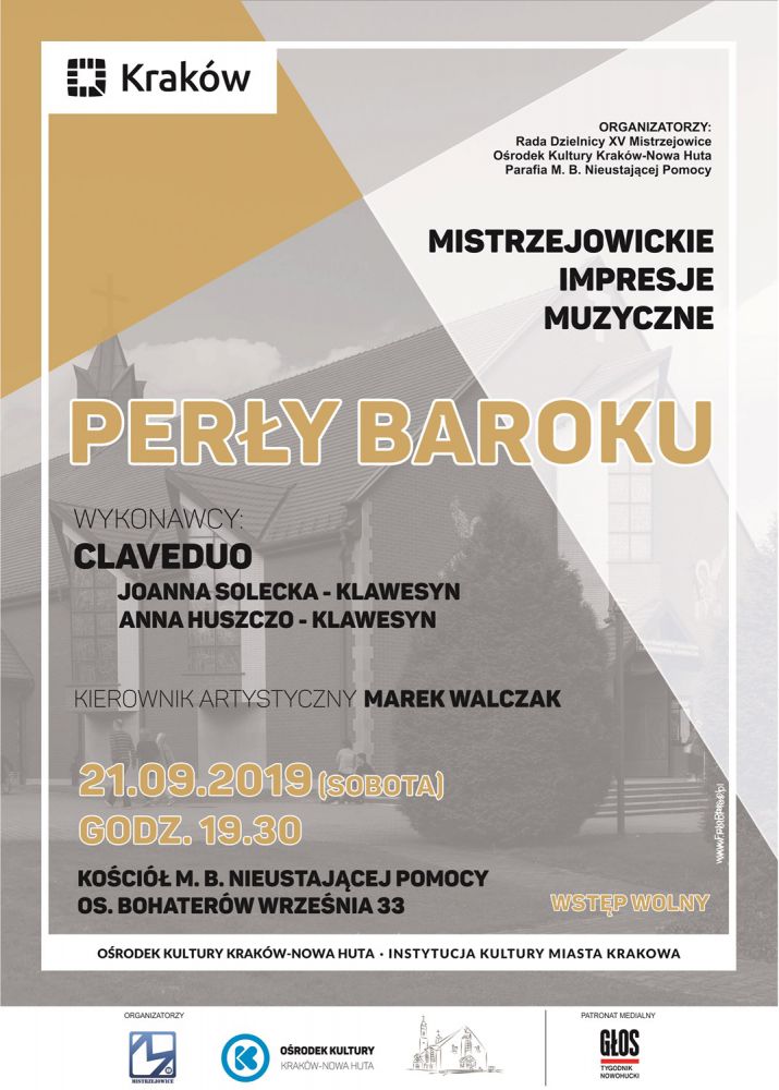 Rada i Zarzšd Dzielnicy XV Mistrzejowice, Oœrodek Kultury Kraków-Nowa Huta oraz Parafia Matki Bożej Nieustajšcej Pomocy zapraszajš w ramach cyklu Mistrzejowickie Impresje Muzyczne na koncert Perły baroku na dwa klawesyny w wykonaniu ClaveDuo - Joanny Soleckiej i Anny Huszczo. ClaveDuo (Anna Huszczo i Joanna Solecka) to formacja o ugruntowanej renomie i dużym doœwiadczeniu estradowym, działajšca już od wielu lat. W rozległym repertuarze zespołu znajdujš się utwory od XVI do XXI wieku. Szczególnš atencjš zespół darzy muzykę polskš, zarówno dawnš, jak i najnowszš. W programie koncertu znajdš się przede wszystkim kompozycje kompozytorów XVII i XVIII wiecznych takich jak: Adam Jarzębski, Marcin Mielczewski, Jan Sebastian Bach, Bernardo Pasquini oraz Gaspar de Roux ale również póŸniejszych Camila Saint - Saensa oraz Edwina McLeana. Koncert odbędzie się w sobotę 21 wrzeœnia o godz. 19.30 w Koœciele Matki Bożej Nieustajšcej Pomocy (os. Bohaterów Wrzeœnia 33).