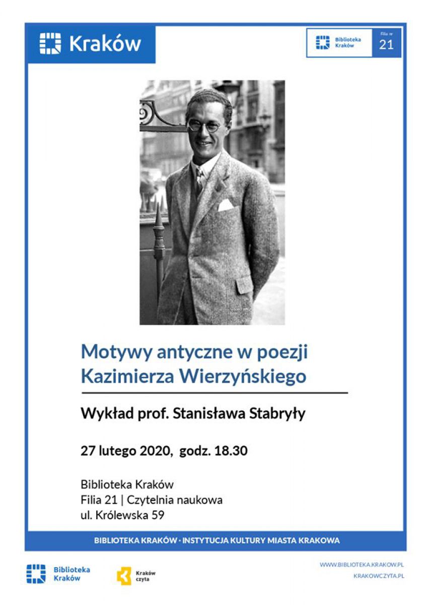 Zapraszamy na wykład prof. Stanisława Stabryły – polskiego filologa klasycznego, profesora zwyczajnego Uniwersytetu Jagiellońskiego, autora publikacji naukowych i popularnonaukowych – na temat literatury łacińskiej okresu augustowskiego oraz kultury antycznej, przybliży sylwetkę i twórczoœć Kazimierza Wierzyńskiego, polskiego poety, prozaika, eseisty, zdobywcy złotego medalu w konkursie literackim IX Letnich Igrzysk Olimpijskich w Amsterdamie w 1928 r. Współzałożyciela gru­py po­etyc­kiej Ska­man­der.