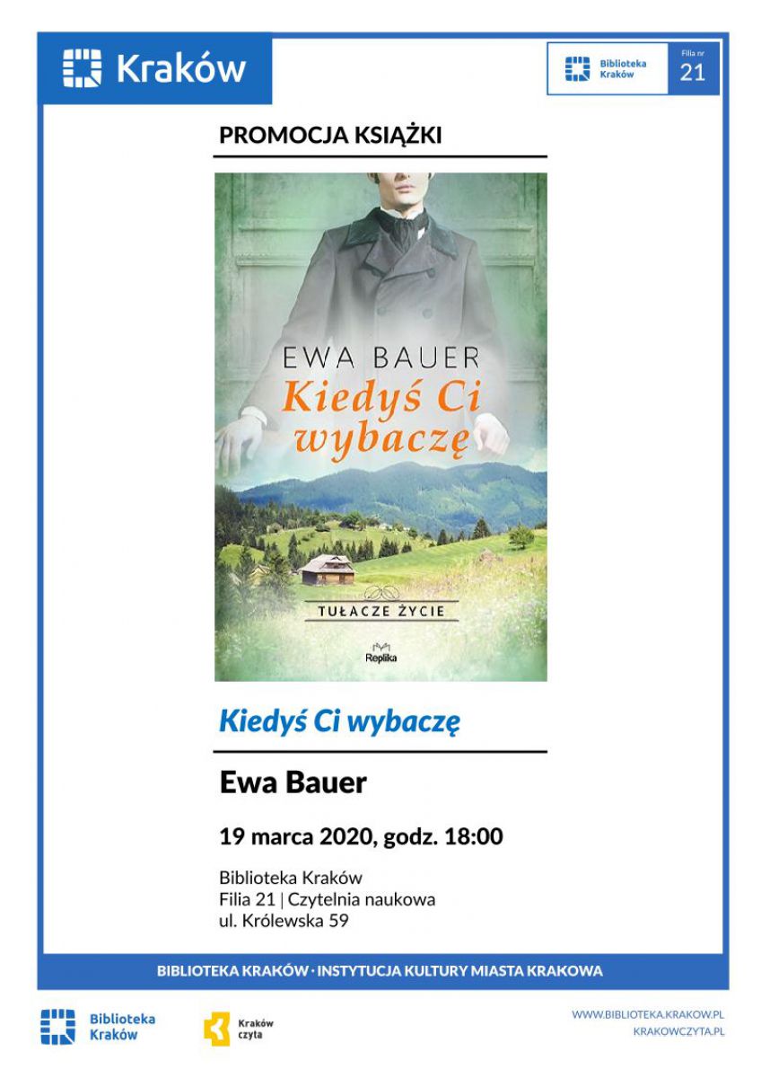 Spotkanie autorskie z Ew Bauer poczone z promocj najnowszej ksiki: Kiedy ci wybacz. Ewa Bauer z wyksztacenia jest prawniczk, ale swoje serce oddaa literaturze. Pisarka od 2011 roku wydaa kilka powieci, m.in.: W nadziei na lepsze jutro, Krucho jutra, Kurhanek Maryli, Soneczne jutro, Ucieczka przed yciem, Za nasze winy.