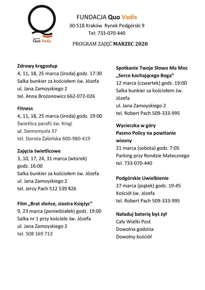 Fundacja Quo Vadis. Program zajęć marzec 2020