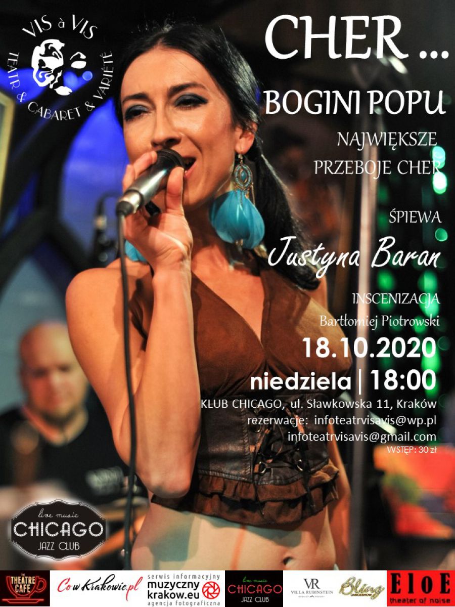 Podczas koncertu największe przeboje CHER BOGINI POPU zapiewa dla Państwa artystka Teatru VIS A VIS aktorka i wokalistka obdarzona niezwykłym głosem oraz ogromnym temperamentem scenicznym JUSTYNA BARAN.
