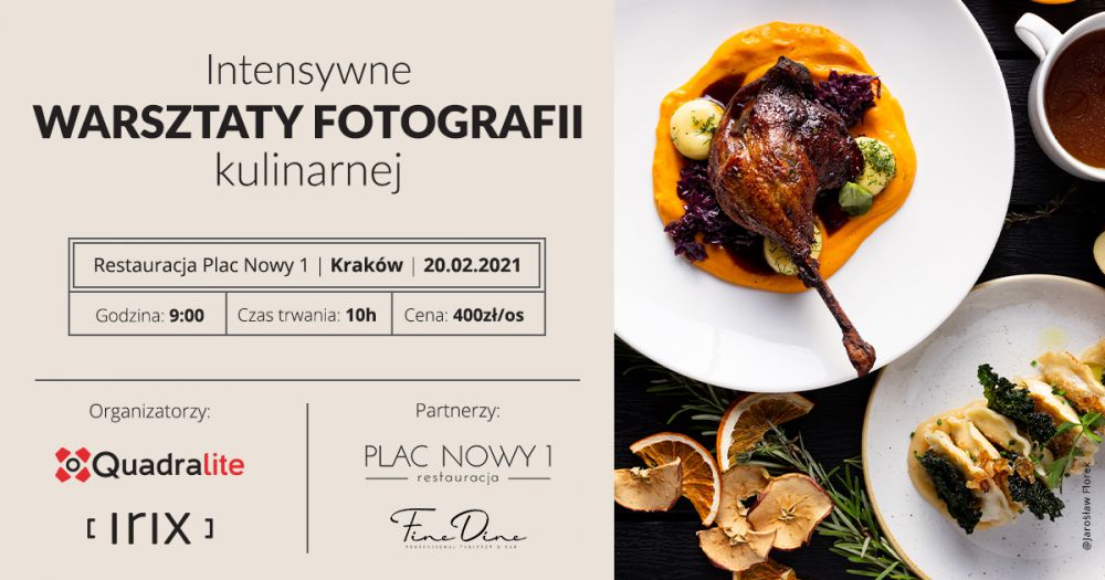 Firma Next77 oficjalny dystrybutor marek Irix oraz Quadralite zaprasza na wyjštkowe, intensywne warsztaty z fotografii kulinarnej, podczas których dowiecie się, jakie sš podstawowe aspekty wykonywania atrakcyjnych ujęć i stylizacji jedzenia. Aby móc wykorzystać pełnię możliwoci sprzętu poznacie wiele zagadnień technicznych dotyczšcych ustawień aparatu i owietlenia w celu uzyskania profesjonalnych rezultatów robišc zdjęcia żywnoci. Zapraszamy do spędzenia wyjštkowo produktywnych dziesięciu godzin w przepięknym wnętrzu krakowskiej restauracji Plac Nowy 1 zgłębiajšc tajniki fotografowania potraw i poznajšc proces powstawania wybranych dań!