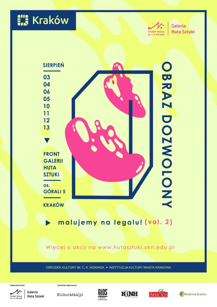 Już drugi raz zapraszamy do wspólnego malowania w ramach projektu Obraz dozwolony - malujemy na legalu! W akcji może włšczyć się każdy, niezależnie od wieku. Przed Galeriš Huta Sztuki czekać na Was będzie nietypowa ciana, na której wspólnie stworzymy obraz! Na wszystkich zainteresowanych udziałem w tworzeniu zbiorowej pracy będziemy czekać na os. Górali 5, przed Galeriš Huta Sztuki, między 3 lipca, a 13 sierpnia, w godzinach funkcjonowania Galerii. Wstęp wolny.