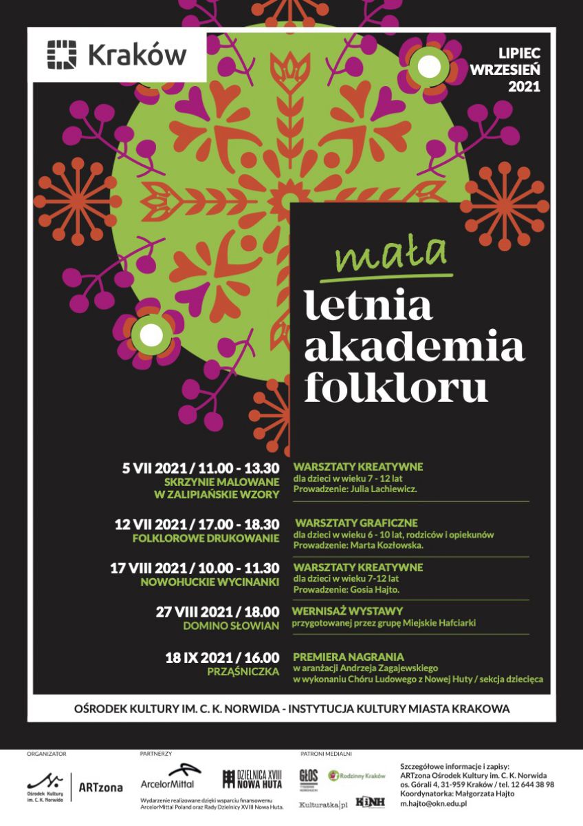 ARTzona Orodka Kultury im. C. K. Norwida zaprasza dzieci w wieku 7-12 lat na warsztaty kreatywne pt. Nowohuckie wycinanki odbywajšce się w ramach Małej LETNIEJ AKADEMII FOLKLORU. Podczas warsztatów uczestnicy poznajš historię i sztukę wycinankarstwa, tradycje zwišzane z tym rodzajem sztuki ludowej. Na koniec zajęć dzieci wykonajš tradycyjne wycinanki z papieru inspirowane wzorami pochodzšcymi z regionu Małopolska.