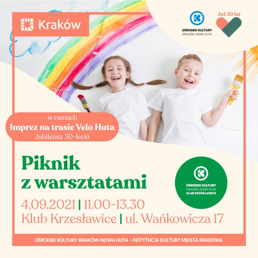 Klub Krzesławice Oœrodka Kultury Kraków-Nowa Huta (ul. M. Wańkowicza 17) zaprasza na warsztatowy piknik na terenie zielonym przy budynku Klubu. Z okazji obchodzonego w tym roku jubileuszu 30-lecia działalnoœci Oœrodka Kultury Kraków-Nowa Huta w sobotę 4 wrzeœnia w godz. 11.00-13.30 Instruktorki Klubu zaplanowały warsztaty plastyczne, podczas których powstanš wielkoformatowe prace zwišzane z Oœrodkiem Kultury i przyœwiecajšcym mu hasłem „Tworzymy to miejsce razem”. Wszystkich, którzy przemierzać będš w tym dniu rowerowy szlak Velo Huta, zachęcamy, aby zrobić przystanek przy Klubie, odpoczšć i skorzystać z przygotowanych atrakcji.