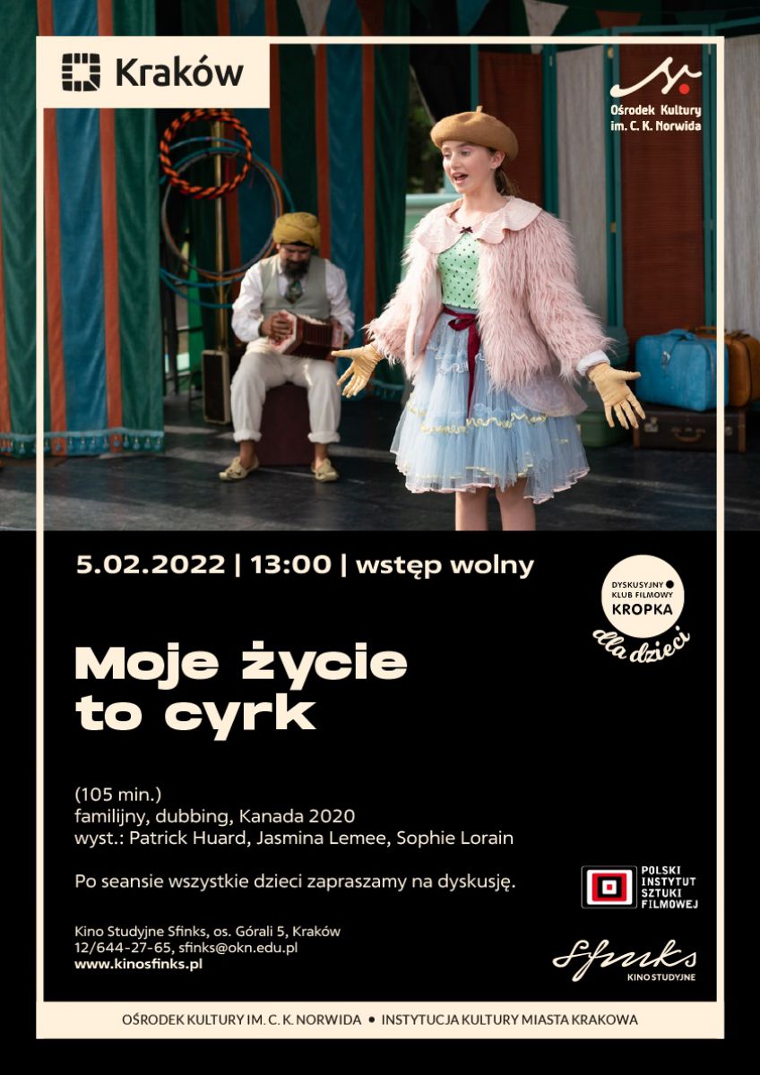 5 lutego o godz. 13:00 zapraszamy do Kina Sfinks na Dyskusyjny Klub Filmowy Kropka dla dzieci, w ramach którego przygotowalimy projekcję filmu Moje życie to cyrk oraz dyskusję po zakończonym seansie. Film opowiada historię dwunastoletniej Laury, która wychowuje się wród artystów cyrkowych, jednak potajemnie marzy o innym mniej szalonym życiu. Plany mogš być trudne do zrealizowania, gdyż dziewczynka całe życie spędza w trasie koncertowej ze swoim ojcem, który jest zawodowym klaunem. Jednak w szkole dziewczynki pojawia się nowa nauczycielka, która dostrzega w Laurze potencjał i mocno wierzy w jej talent do nauki. Czy to oznacza zmiany? I co na to tata Laury?