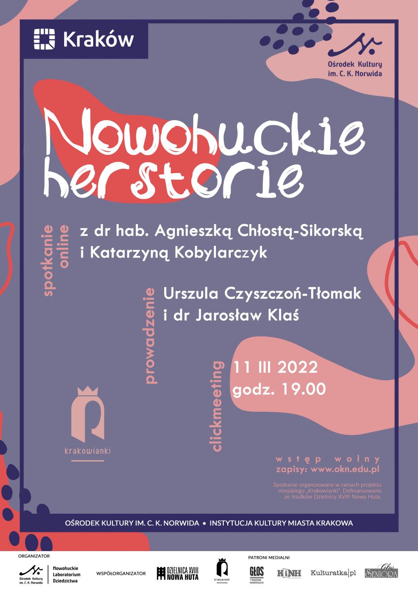 Wstęp wolny. Obowišzujš zapisy na: https://okn.clickmeeting.com/miesiac-krakowianek-nowohuckie-herstorie-/register. Limit miejsc w pokoju webinarowym: 50 os.