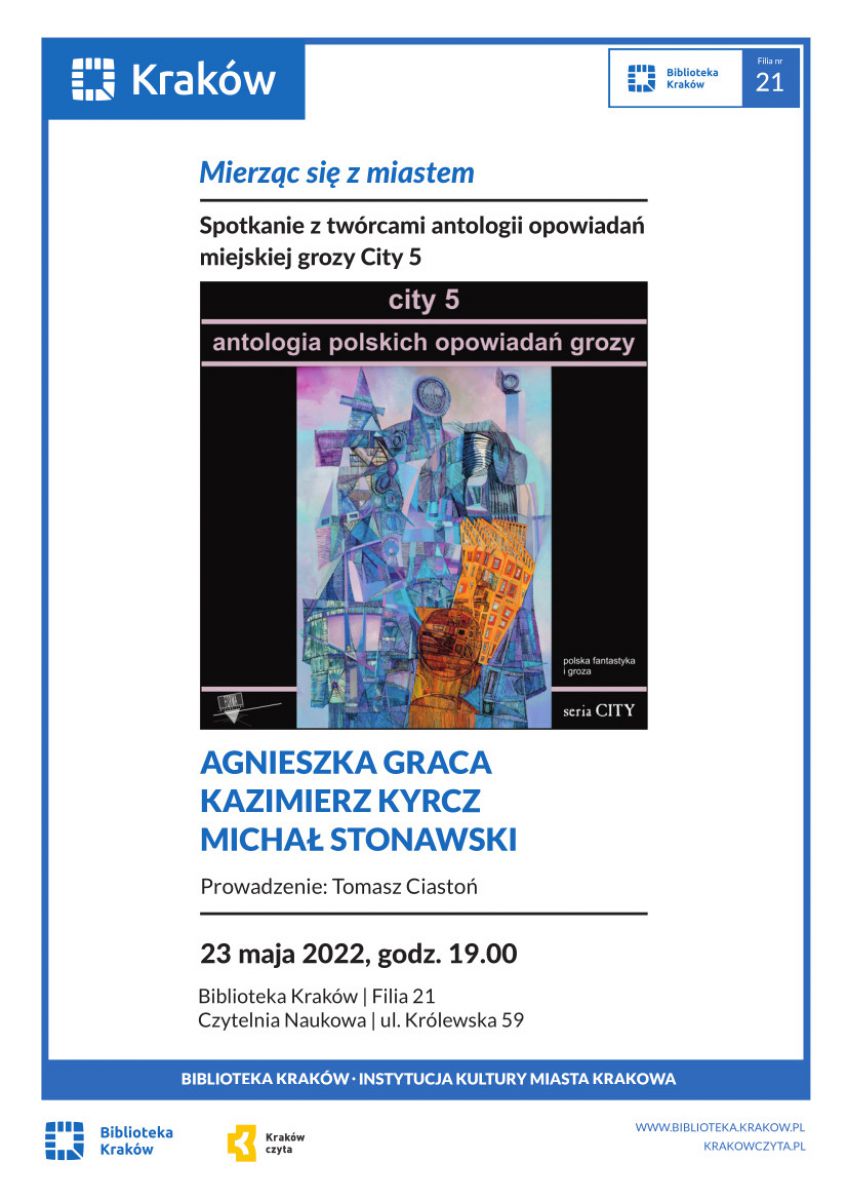 Spotkanie z Agnieszk Grac, Kazimierzem Kyrczem Jr. oraz Michaem Stonawskim wspautorami ksiki City 5. Antologia polskich opowiada grozy. Pisarze opowiedz o miastach ich kulturze, artystach, moliwociach, ale rwnie anonimowoci, problemach itp.