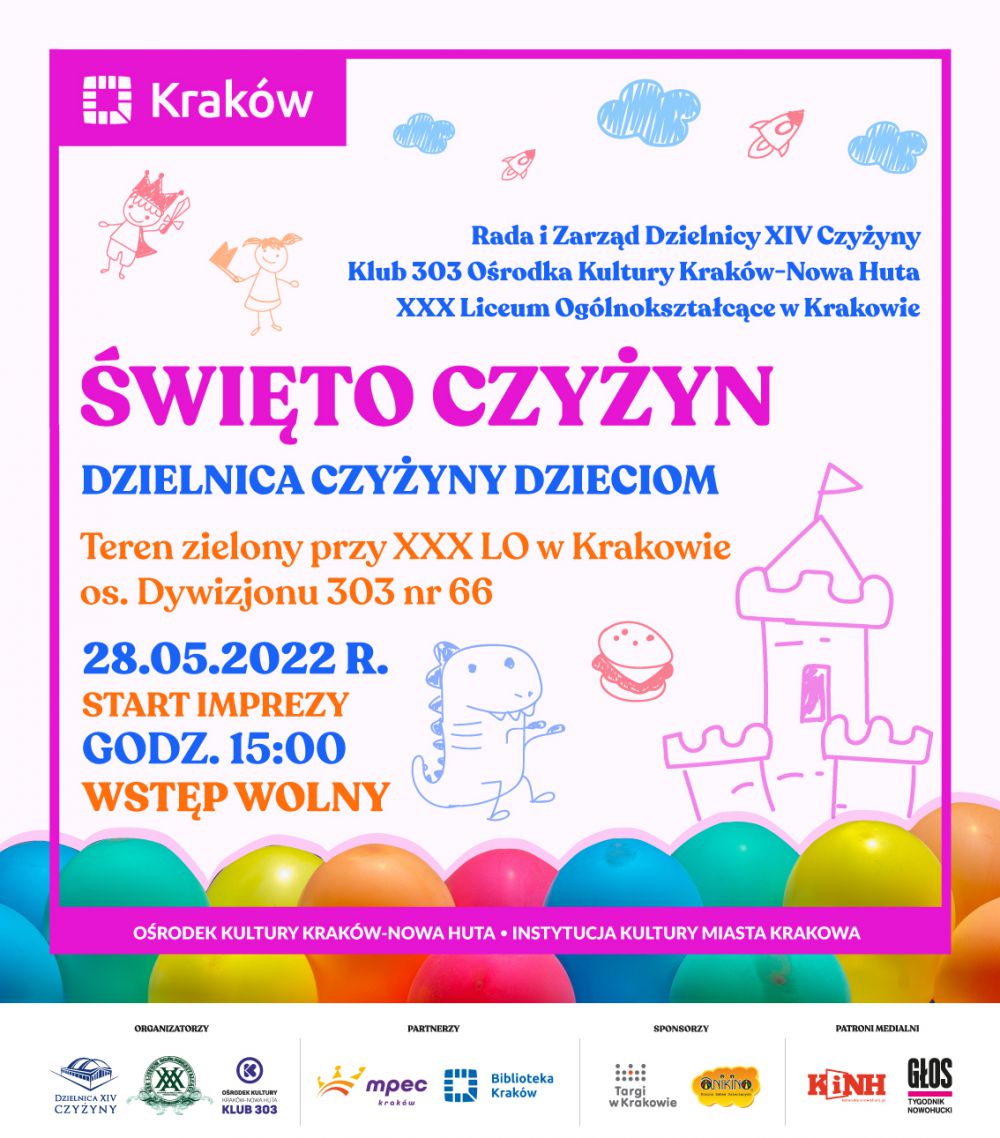 WIĘTO CZYŻYN powraca! Jest nam niezwykle miło, że po dwóch latach przerwy możemy zaprosić mieszkańców Czyżyn i nie tylko, do wspólnej zabawy. Organizatorzy: Rada i Zarzšd Dzielnicy XIV, Klub 303 Orodka Kultury Kraków-Nowa Huta, XXX Liceum Ogólnokształcšce przygotowali rozmaite atrakcje: