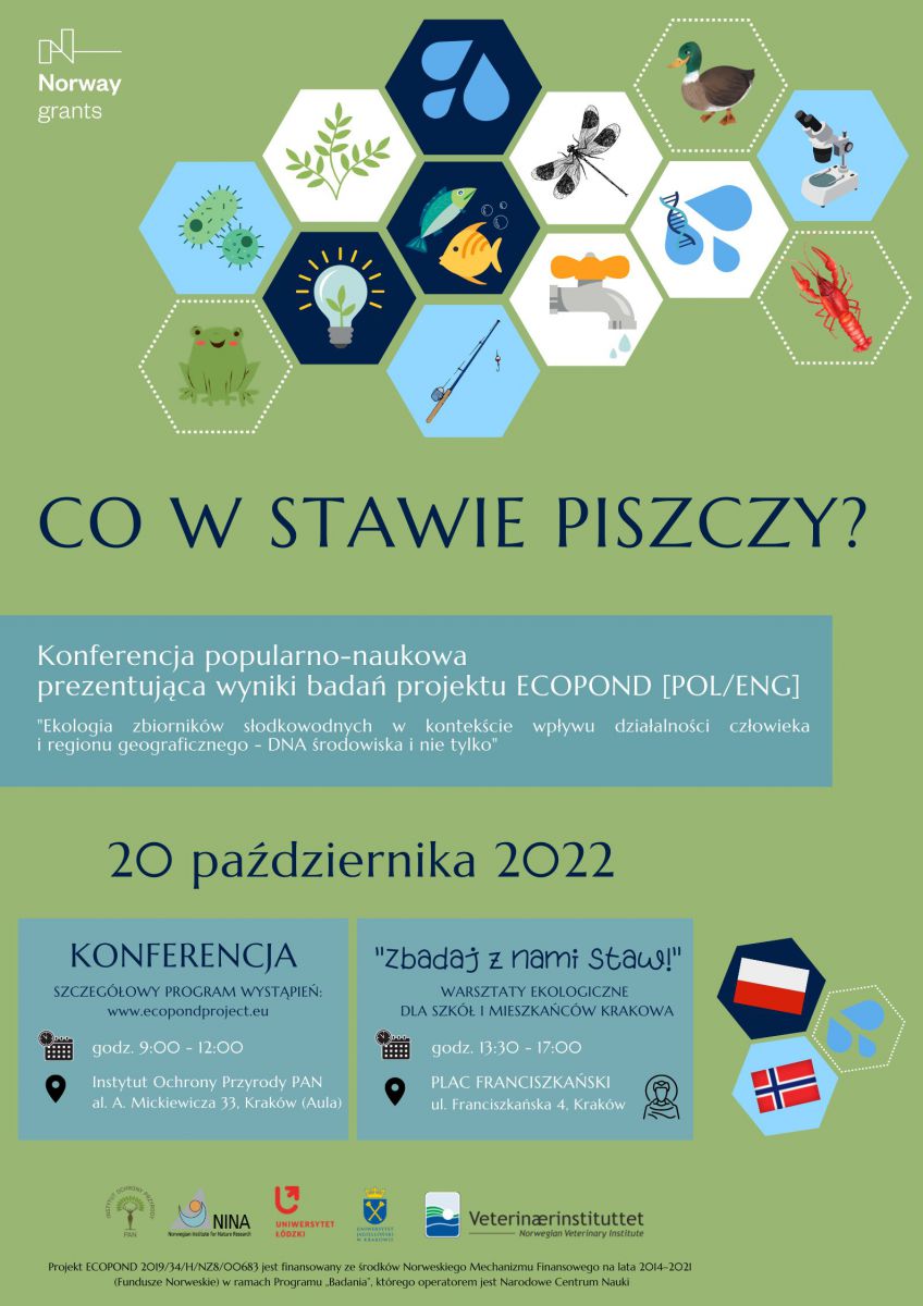 W związku z realizacją projektu ECOPOND "Ekologia zbiorników słodkowodnych w kontekście wpływu działalności człowieka i regionu geograficznego - DNA środowiskowe i nie tylko" oraz publikacją pierwszych wyników badań mamy przyjemność zaprosić na zieloną i ekologiczną konferencję popularno-naukową, która odbędzie się dnia 20 październik 2022r.
