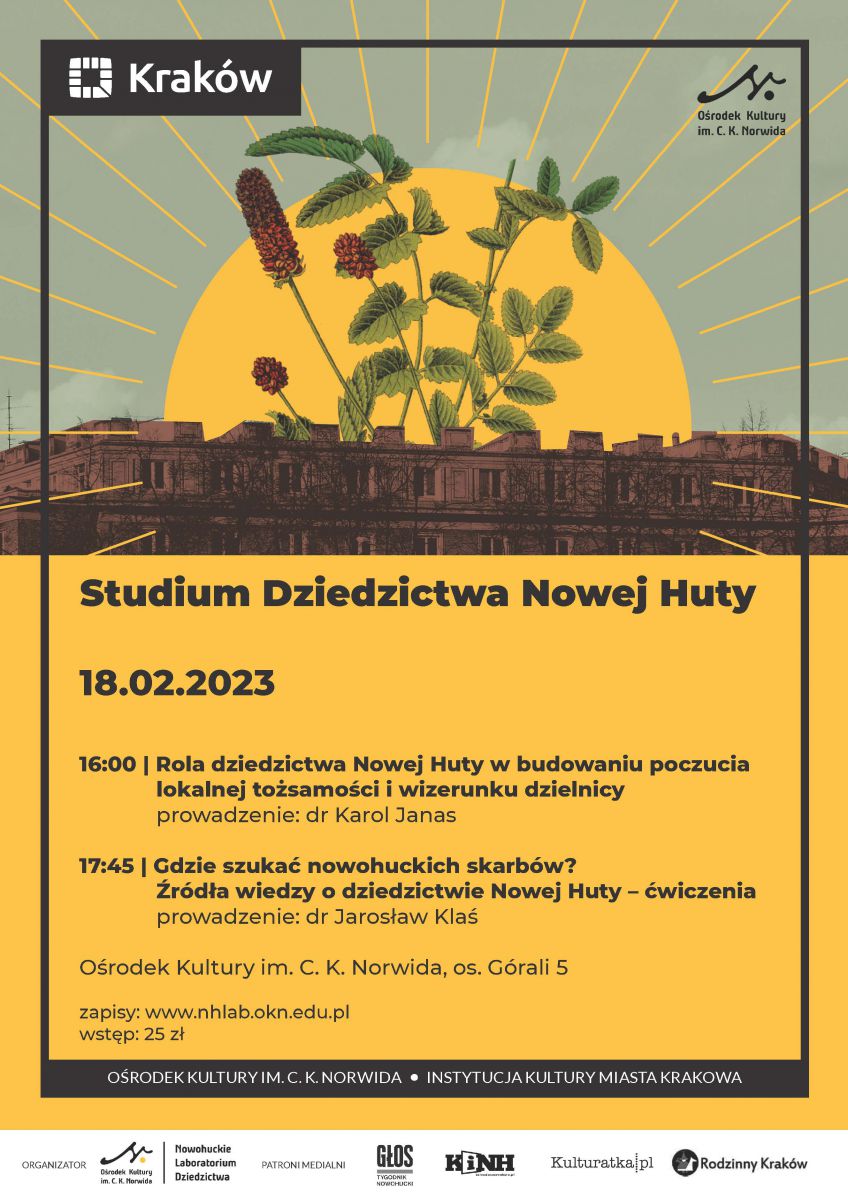 Wstęp: 25 zł (dla osób niezapisanych na cały cykl). Obowiązują zapisy (do 17 lutego do godz. 15:00) przez formularz na stronie: https://okn.edu.pl/nowohuckie-laboratorium-dziedzictwa/studium-dziedzictwa-nowej-huty-rola-dziedzictwa-nowej-huty-w-budowaniu-poczucia-lokalnej-tozsamosci-i-wizerunku-dzielnicy-zapisy/
