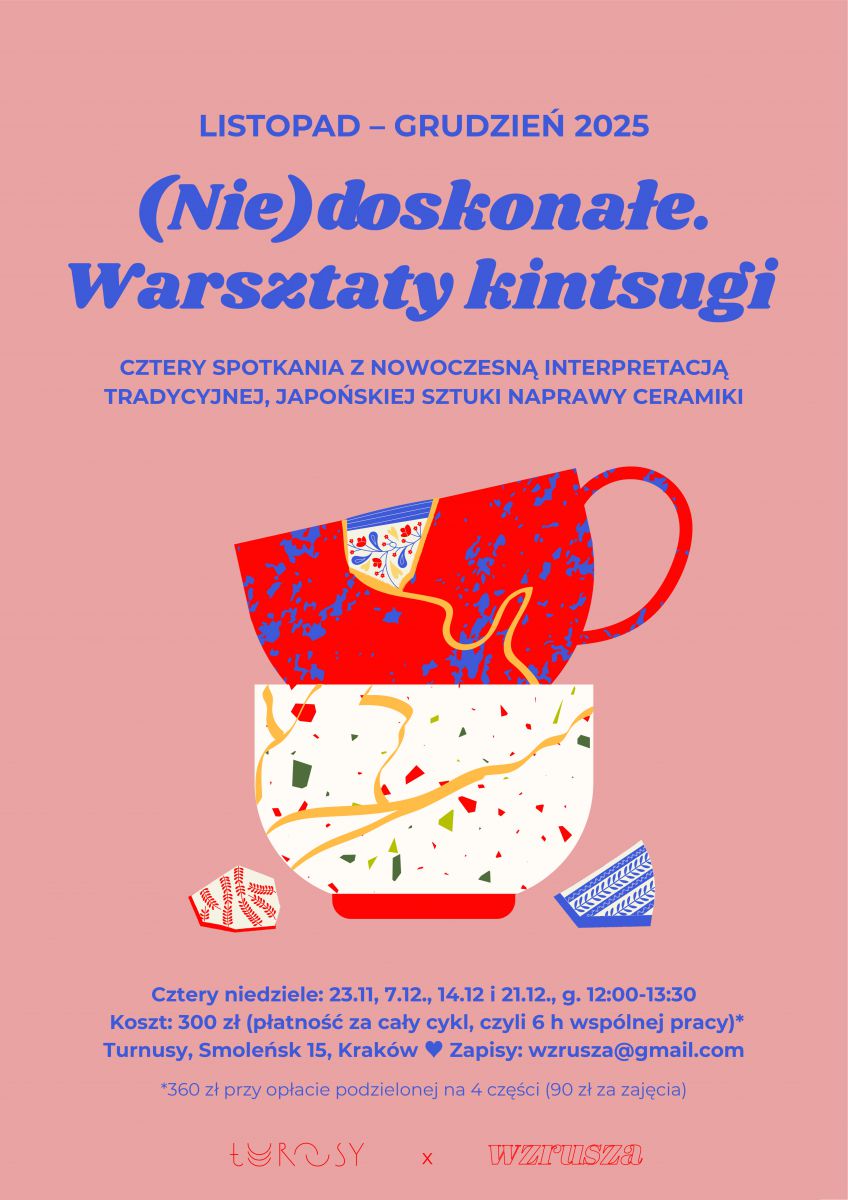 Kintsugi (dosł. łączenie złotem) to japońska sztuka i filozofia naprawiania naczyń i innych wyrobów ceramicznych. Tradycyjnie elementy łączono za pomocą laki, tj. specjalnej żywicy pozyskiwanej z drzewa – sumaka lakowego. Dodawano do niej sproszkowane metale szlachetne: złoto, srebro lub platynę. Obecnie zamiast laki najczęściej stosuje się kleje syntetyczne i to z nimi będziemy pracować podczas zajęć*.