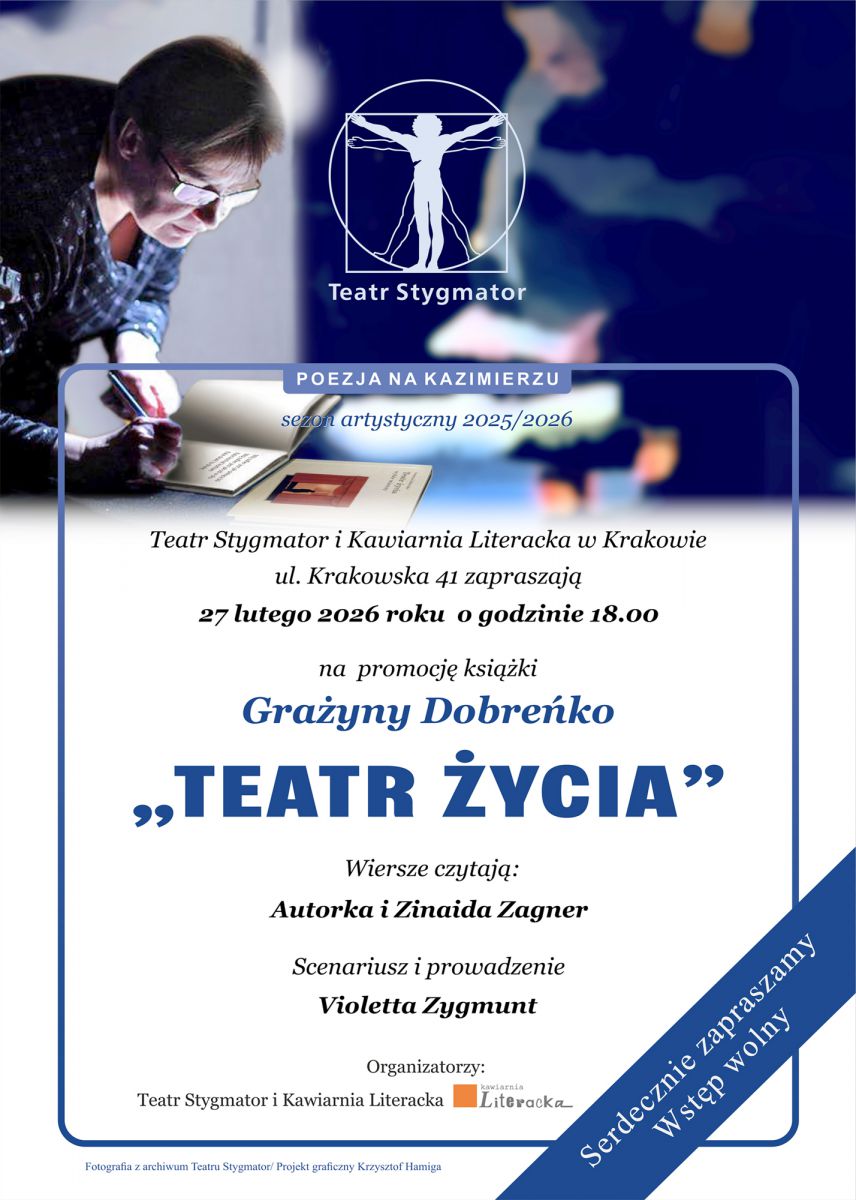 POEZJA NA KAZIMIERZU-Teatr Stygmator zaprasza to cykliczne wydarzenia poetycko-artystyczne. Pomysłodawczynią i prowadzącą jest Violetta Zygmunt. Odbywają się w Kawiarni Literackiej, ul. Krakowska 41 na Krakowskim Kazimierzu w ostatni piątek miesiąca. o stałej porze tj. o godzinie 18.00. Wstęp wolny.