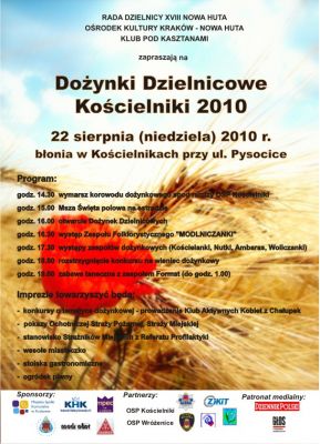 Konkurs na wieniec dożynkowy, przypiewki zespołów dożynkowych, występ Zespołu Folklorystycznego Modlniczanki, pokazy walki, a także zabawa taneczna to tylko niektóre z atrakcji przygotowanych w ramach Dożynek Dzielnicowych Kocielniki 2010, które odbędš się 22 sierpnia (niedziela) na Błoniach Kocielnicki, ul. Pysocice, os. Kocielniki.