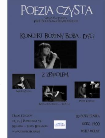 Dwr Czeczw zaprasza na koncert pt. Poezja czysta. Wieczr z poezj prof. Bogusawa urakowskiego w wykonaniu Boeny Boby-Dygi wraz z zespoem.
