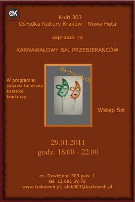 Na pełen radoœci i dobrej zabawy bal przebierańców dla dorosłych zaprasza Klub 303 Oœrodka Kultury Kraków – Nowa Huta.