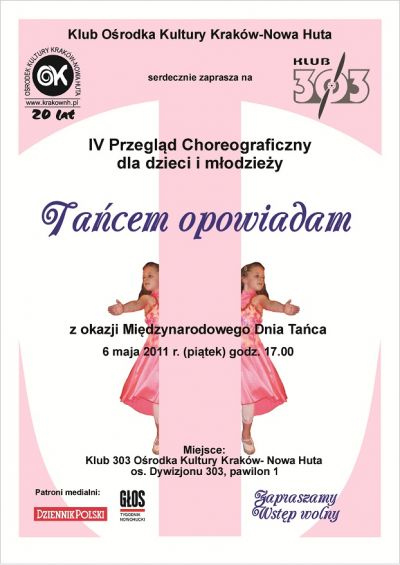 Klub Oœrodka Kultury Kraków – Nowa Huta zaprasza 6 maja (pištek) 2011 r. o godz. 17.00 na prezentację twórczoœci choreograficznej dzieci z okazji Międzynarodowego Dnia Tańca.