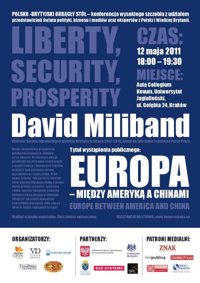 Centrum Strategii Europejskiej demosEuropa wspólnie z Fundacjš Unia&Polska, brytyjskim Chatham House, Uniwersytetem w Oxfordzie i Stowarzyszeniem Willa Decjusza zapraszajš 12 maja, o godz. 18.00 do Auli Collegium Novum Uniwersytetu Jagiellońskiego (Kraków, ul. Gołębia 24) na wystšpienie Davida Milibanda, Ministra Spraw Zagranicznych Wielkiej Brytanii w latach 2007 -2010. Wykład pt. Europa między Amerykš a Chinami i póniejsza debata prowadzona przez Krzysztofa Bobińskiego otworzš czwartš edycję dorocznej konferencji Polsko-Brytyjski Okršgły Stół.