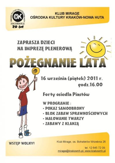 Klub Mirage Orodka Kultury Krakw-Nowa Huta, SM Mistrzejowice-Pnoc, TKKF Apollo zapraszaj dzieci na imprez sportowo-rekreacyjn pod hasem Poegnanie Lata.