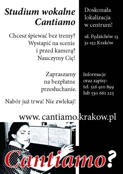 Cantiamo to nowa , muzyczna inicjatywa w magicznym, starym Krakowie. Każdy, dla kogo piew jest pasjš lub spełnieniem marzeń zawodowych otrzyma w naszym studium możliwoć rozwoju umiejętnoci wokalno - aktorskich w zakresie muzyki operowej, oratoryjnej i estradowej oraz pracy przed kamerš.