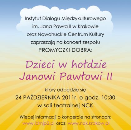 organizujš koncert zespołu PROMYCZKI DOBRA w ramach obchodów liturgicznego wspomnienia błogosławionego Jana Pawła II 24 padziernika 2011r. o godzinie 10:30 w sali teatralnej NCK.