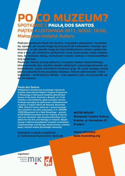 Paula dos Santos pracuje głównie z muzeami wiata niezachodniego, które powstały jako rezultat inicjatyw oddolnych i samoorganizowania się konkretnych, często niewielkich lokalnych grup. W czasie swojego wystšpienia przywoła liczne przykłady inicjatyw, którym patronowała i które wspierała od Brazylii po Afrykę oraz opowie o tym, co przyczyniło się do ich sukcesu.
