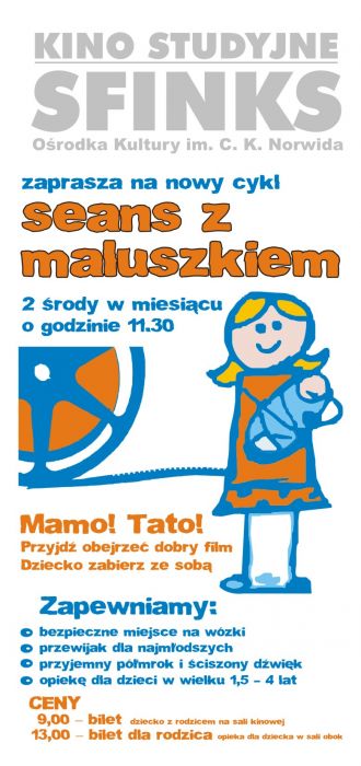 Podczas cyklu SEANS Z MALUSZKIEM proponujemy wspólne, dopołudniowe projekcje dobrych filmów, na które zapraszamy rodziców wraz z dziećmi gwarantujšc szczególnie dobrany repertuar (kino o wysokich walorach zdjęciowych i muzycznych, bez scen przemocy), zaplecze organizacyjne przyjazne rodzicom (przewijak dla najmłodszych, bezpieczne miejsce na wózki oraz możliwoœć pozostawienia dzieci w wieku 1.5 - 4 lat pod opiekš w pomieszczeniach obok kina) a także przyjemny półmrok na sali kinowej i œciszony dŸwięk dla tych rodziców, którzy zechcš oglšdnšć film w towarzystwie swojej pociechy. Spotkania odbywajš się w Kinie Sfinks dwa razy w miesišcu, w godzinach dopołudniowych.