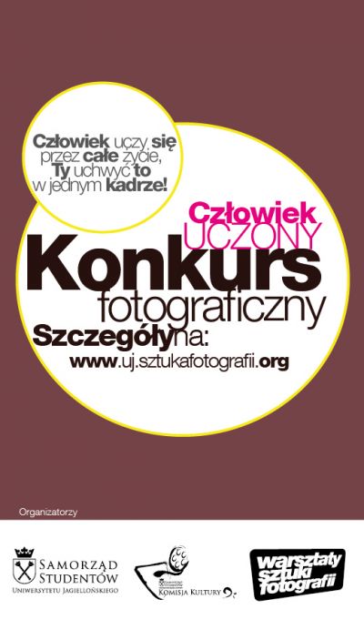 Tematem konkursu jest CZŁOWIEK UCZONY. Dowolnie zinterpretuj podane hasło! Konkurs przeznaczony jest dla studentów Uniwersytetu Jagiellońskiego. Prace przyjmujemy od 9.12. do 9.01.2011. WejdŸ na stronę www.uj.sztukafotografii.org, aby zgłosić zdjęcia do konkursu.