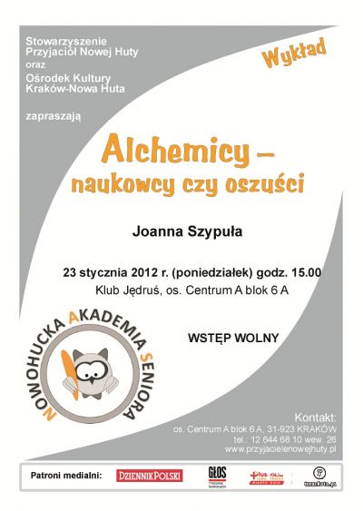 Nowohucka Akademia Seniora zaprasza na wykład przybliżajšcy tajemnice alchemii, który odbędzie się 23 stycznia (poniedziałek) 2012 r. o godz. 15.00 w Klubie Jędru Orodka Kultury Kraków-Nowa Huta (os. Centrum A 6a).