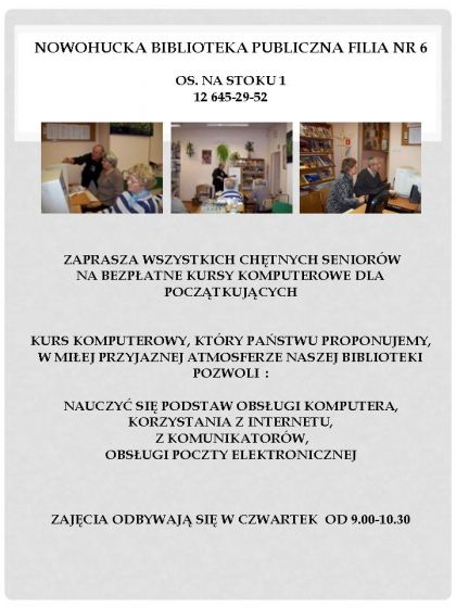 Nowohucka Biblioteka Publiczna w Krakowie uczestniczy w Programie Akademia Orange dla Bibliotek Fundacji Orange. Celem tego projektu jest m. in. aktywizacja osb starszych poprzez edukacj komputerowo-internetow. Uczestnicy kursu poznaj internetowe narzdzia, co umoliwi im wczenie si do aktywnego uczestnictwa w spoeczestwie informacyjnym i poszerzania wiedzy.