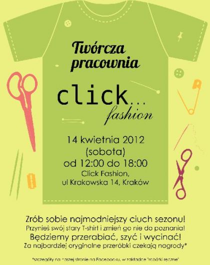 14 kwietnia sklep Click Fashion zamieni się w Twórczš Pracownię! We rzeczy, które już Ci się znudziły, zapro koleżanki i pućcie wodze fantazji. Na miejscu będš czekać na Was igły, nici, guziki, tasiemki i skrawki materiałów.