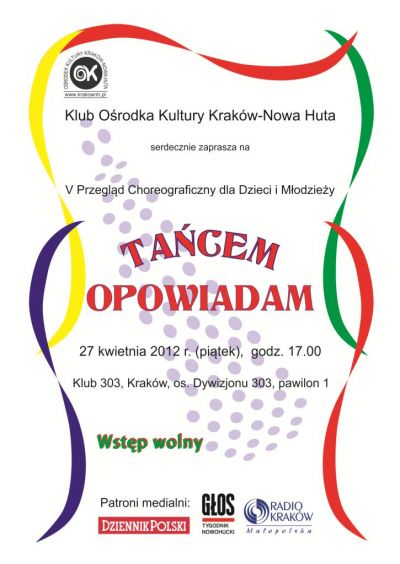 Klub Orodka Kultury Kraków-Nowa Huta zaprasza, z okazji Międzynarodowego Dnia Tańca, na prezentację twórczoci choreograficznej dzieci. Uczestnikami przeglšdu sš miedzy innymi dzieci bioršce udział w zajęciach tanecznych w klubach Orodka Kultury Kraków Nowa Huta. Pomysłodawczyniš przeglšdu jest choreograf baletu Barbara Gatty Kostyal. Regulamin i kartę zgłoszenia można otrzymać w Klubie (os. Zgody 1) od poniedziałku do pištku w godz. od 9.00-19.00 lub pobrać ze strony Orodka - zapisy do dnia 24 kwietnia 2012 r.