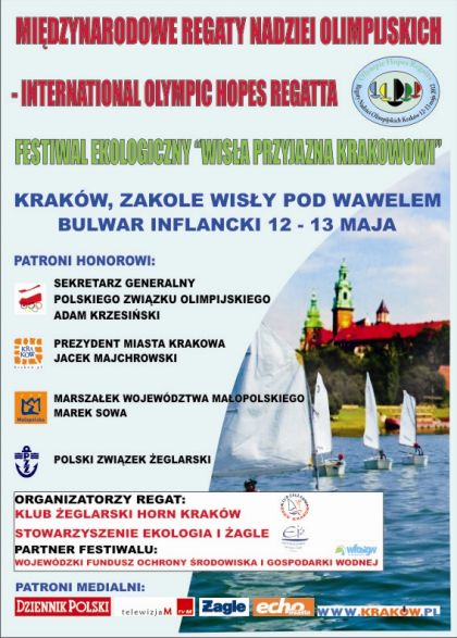W najbliższš sobotę i niedzielę 12 i 13 maja zapraszamy na Bulwary Wiœlane (Bulwar Inflancki) w Krakowie, gdzie zostanš rozegrane Międzynarodowe Regaty Nadziei Olimpijskich. Regaty będš rozgrywane w klasach Laser 4,7, Laser Radial, Europa oraz Optimist. Zgłoszenia zawodników przyjmowane będš do godz. 10.30 w sobotę 12 maja.